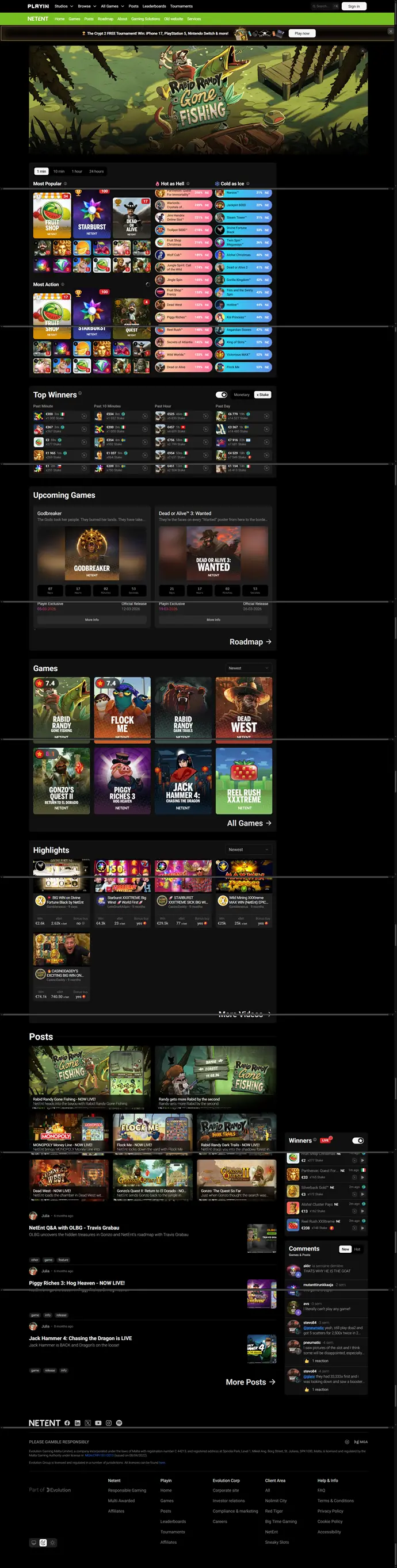 Interfaz del sitio oficial de NetEnt