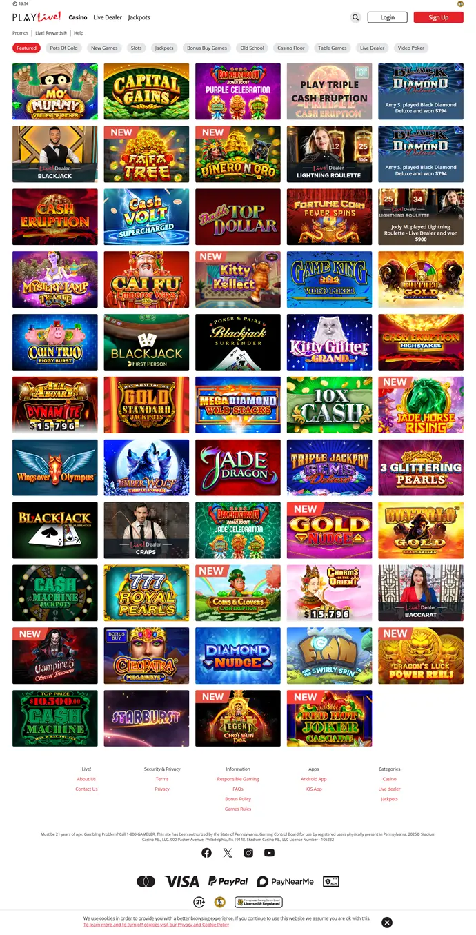 PlayLive! Casino es una plataforma de casino online lanzada por The Cordish Companies en el estado de Pensilvania. El sitio permite a los jugadores ubicados en este territorio acceder a una selección de tragaperras y juegos de mesa a través de internet. La plataforma representa la extensión digital de la marca Live! Casino, conocida por sus casinos presenciales gestionados por el grupo estadounidense.