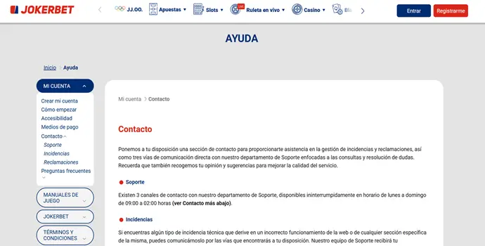 JOKERBET ofrece tres canales de comunicación directa con su departamento de soporte, accesibles de forma regular y con un horario amplio, lo que permite cubrir la mayoría de situaciones que pueden surgir durante una sesión de juego.