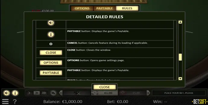 Interfaz de las reglas del juego de Baccarat de Betsoft