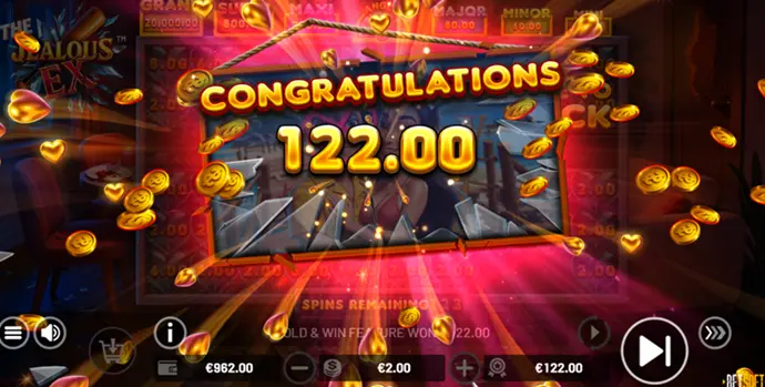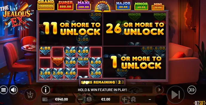 ¡La Hold & Win Feature es el bonus central de The Jealous Ex™! Se caracteriza por su desarrollo progresivo y por transformar de manera radical la configuración del juego.