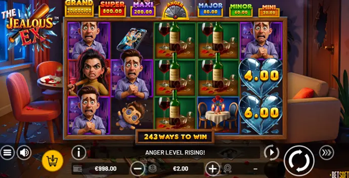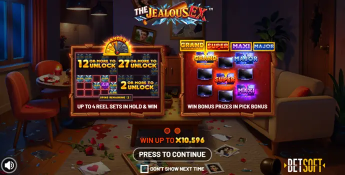 The Jealous Ex™ es una tragaperras en vídeo desarrollada por Betsoft Gaming. El juego gira en torno a una ruptura sentimental, los celos y una discusión de pareja cargada de tensión. La acción se desarrolla en un salón devastado por la ira. Objetos rotos, símbolos con significado y personajes marcados por un fuerte desequilibrio emocional. Esta atmósfera influye directamente en el gameplay y en el ritmo de las funciones.