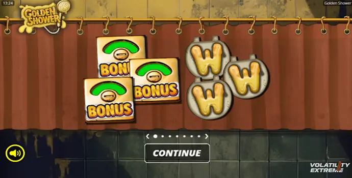 La acción de Golden Shower se sitúa en un espacio poco habitual en el mundo de las tragaperras. Aquí se juega dentro de una ducha pública en mal estado. No es un fondo genérico, sino un entorno trabajado al detalle que dialoga constantemente con la mecánica del juego.