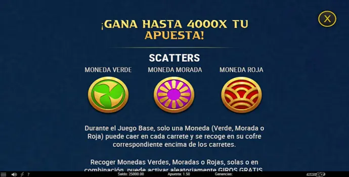 El cofre rojo también activa siete tiradas gratis, pero esta vez el objetivo cambia! Aparecen monedas especiales en los rodillos que pueden revelar jackpots fijos o giros adicionales!