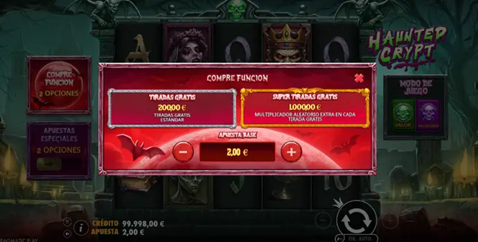 Permite acceder rápido a los Free Spins, pero se salta una parte clave de la experiencia. Haunted Crypt está diseñada para construir tensión antes del bonus. Comprar directamente los Free Spins ofrece una visión técnica de la mecánica, pero reduce gran parte de su impacto emocional. Conviene plantearlo solo después de varias sesiones en demo.