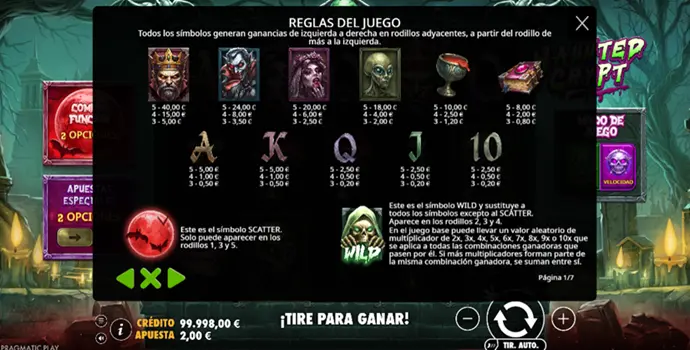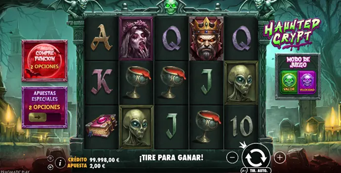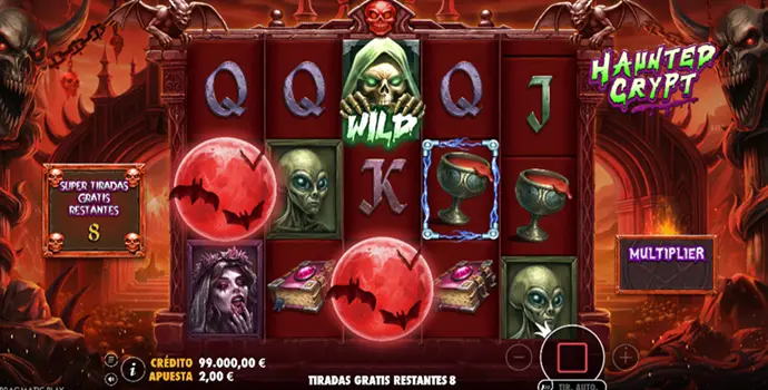 Haunted Crypt es una tragaperras de Pragmatic Play de volatilidad muy alta, disponible en demo gratuita sin límite de tiempo. Este título de terror se apoya en Wilds multiplicadores persistentes y en Free Spins electrificados para construir una tensión progresiva que puede desembocar en un potencial de ganancia de hasta 10.000x.