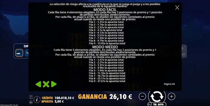 En modo Medium, el juego empieza a apretar. El número de win spots se reduce y el riesgo se vuelve perceptible. Ya no haces clic de forma automática. Comienzas a anticipar el siguiente nivel y a mirar el multiplicador antes de decidirte, adoptando una actitud más estratégica.