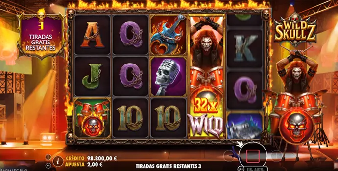 El bonus cristaliza a la perfección esta sensación. Cuando el Wild rockstar aparece en el quinto rodillo y comienza su avance lento, la lógica cambia por completo. En ese instante dejo de pensar en premios inmediatos. Vigilo su posición. Escucho cómo sube la intensidad sonora. Espero el Scatter que pueda reactivar la mecánica. El multiplicador creciente actúa como un imán mental. Cuanto más sube, más difícil resulta aceptar que todo pueda detenerse de forma repentina. Y es precisamente esa incertidumbre lo que hace que la experiencia de Wild Skullz sea tan tensa.