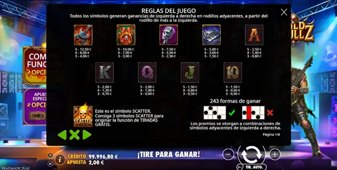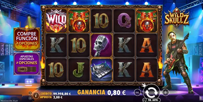 Wild Skullz es una tragaperras de vídeo musical desarrollada por Pragmatic Play y concebida como una experiencia intensa, casi exigente. Aquí se vive el rock, la música pesada y unas mecánicas arriesgadas que cuentan una sola historia. El juego no pretende tranquilizarte, sino mantenerte siempre al filo, con una presión que no afloja.